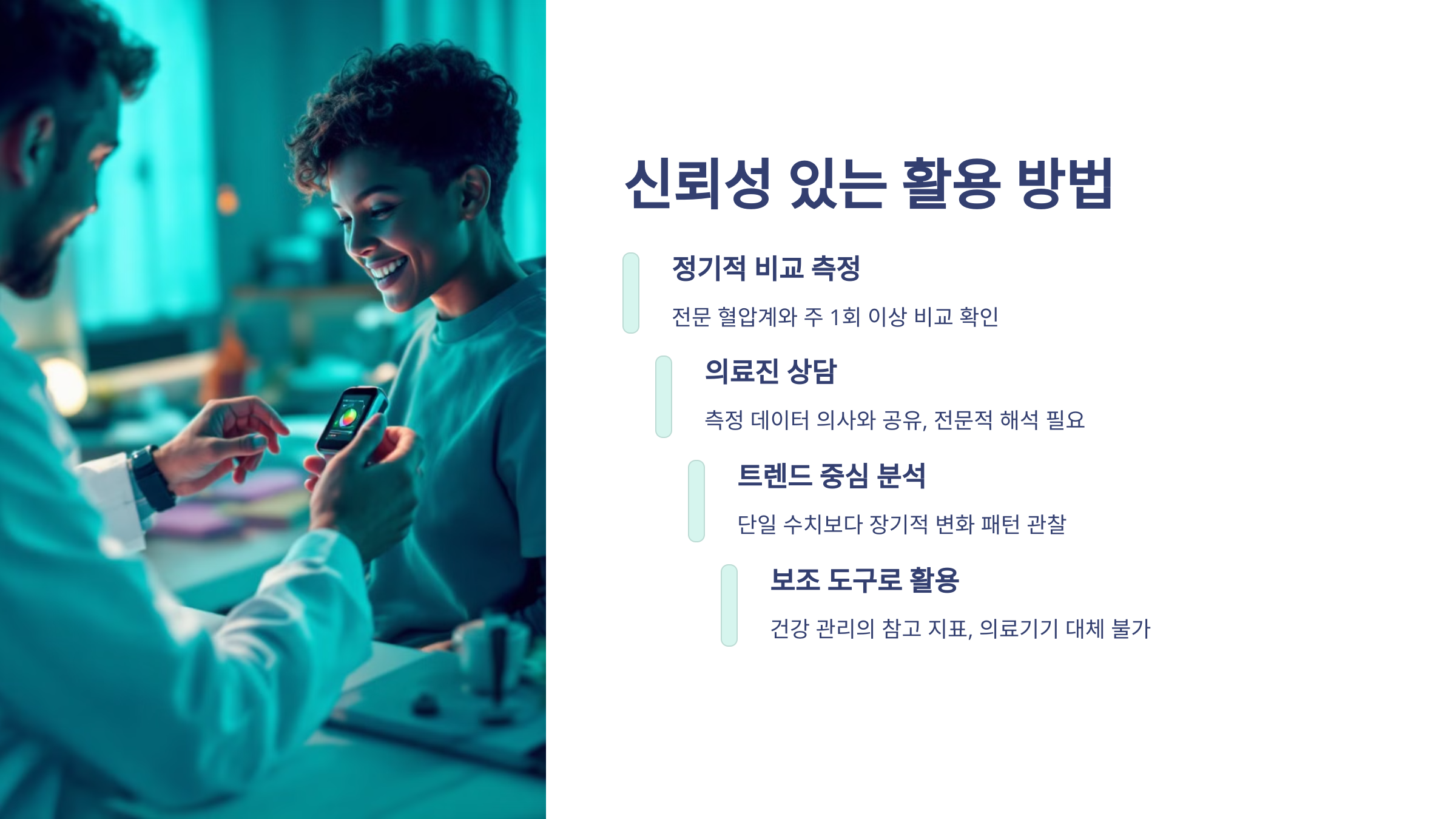 스마트워치로 혈압을 측정할 땐 ‘절대 수치’보다는 일상 흐름 속의 변화를 살펴보는 데 초점을 맞추는 게 좋아요. 그래야 스트레스 없이 꾸준히 사용할 수 있어요.