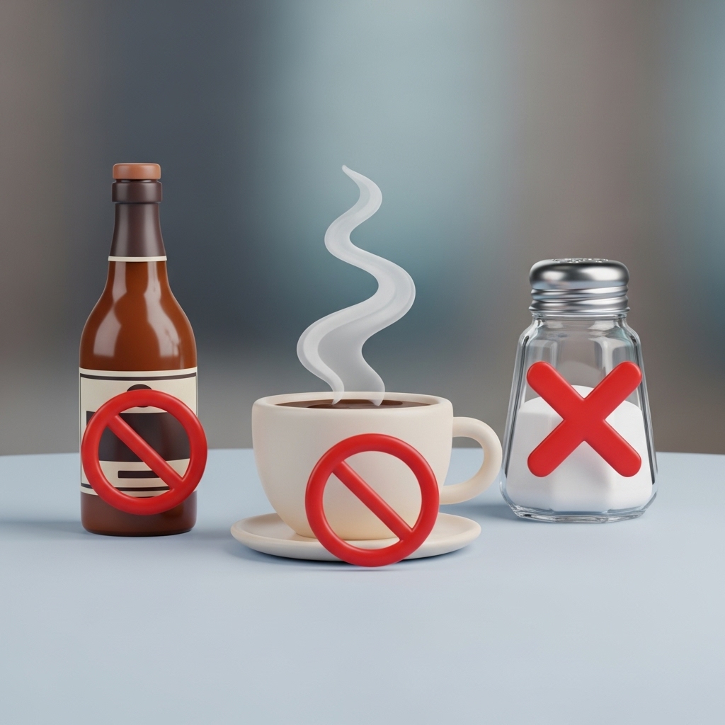 좋은 음식을 챙겨 먹는 것만큼 중요한 것이 바로 피해야 할 음식을 아는 것입니다. 몇 가지 음식은 이석증 증상을 악화시키거나 재발 가능성을 높일 수 있으니 주의하는 것이 좋습니다.