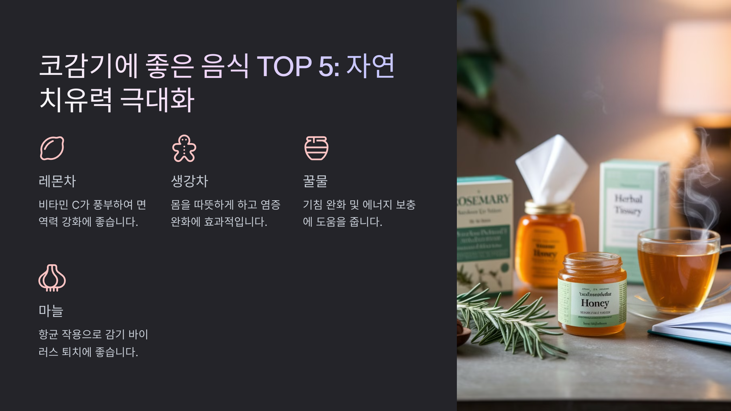 💡 코감기 완화에는 **비타민C·항염 성분**이 풍부한 음식이 좋아요. 🍯🍋