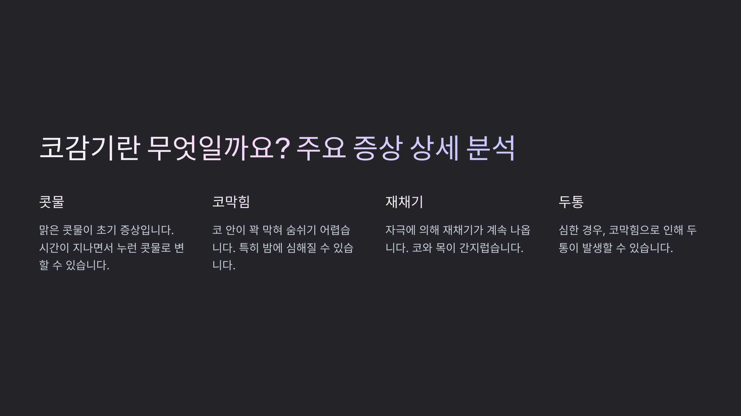 - 🤧 **콧물:** 맑은 콧물로 시작해 점차 노랗게 변함