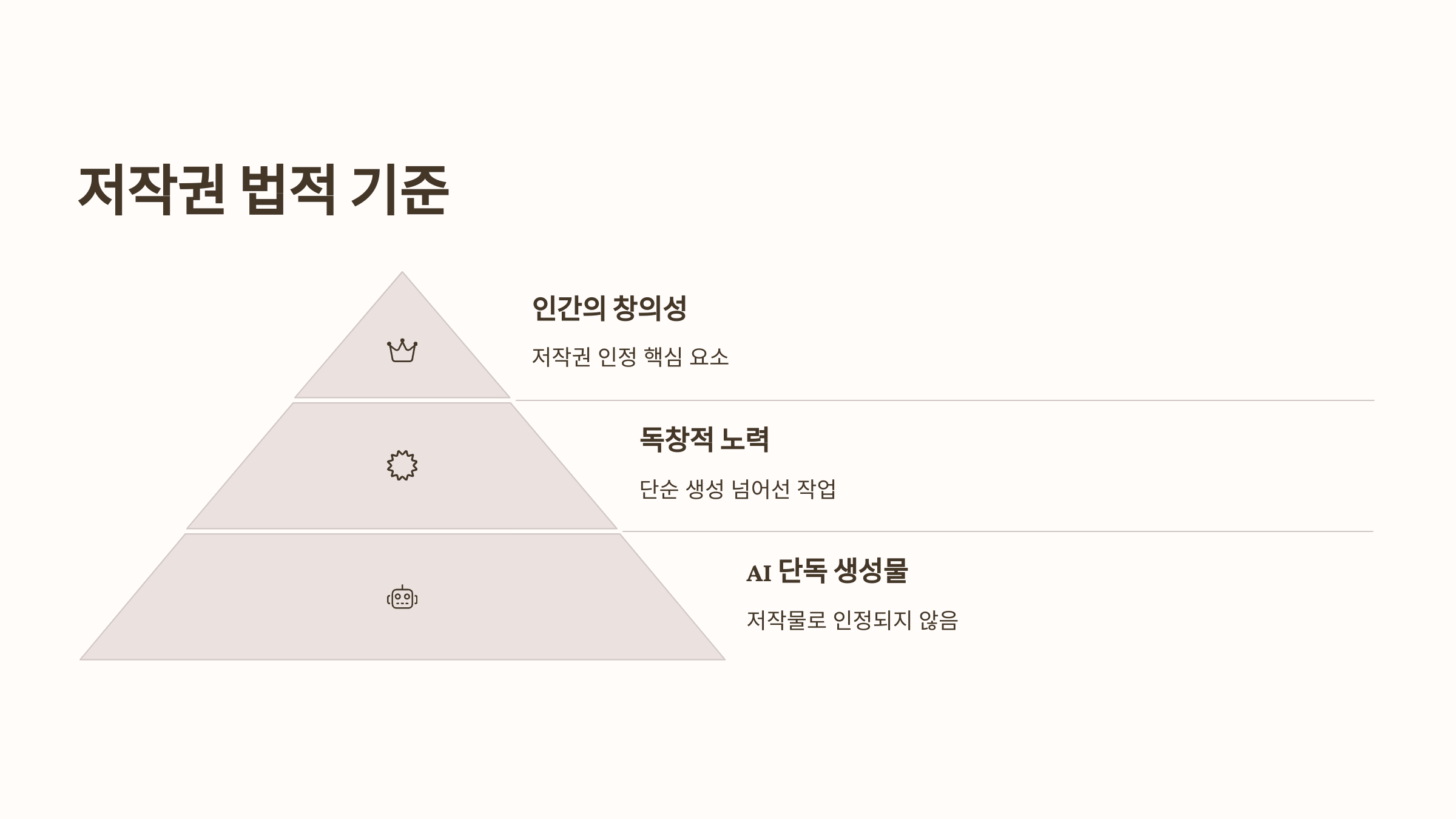 ✔ 한국 저작권법은 명확해요. 사람이 직접 창작한 경우에만 저작물로 인정돼요. AI가 혼자 만든 결과물은 보호 대상이 아니에요.