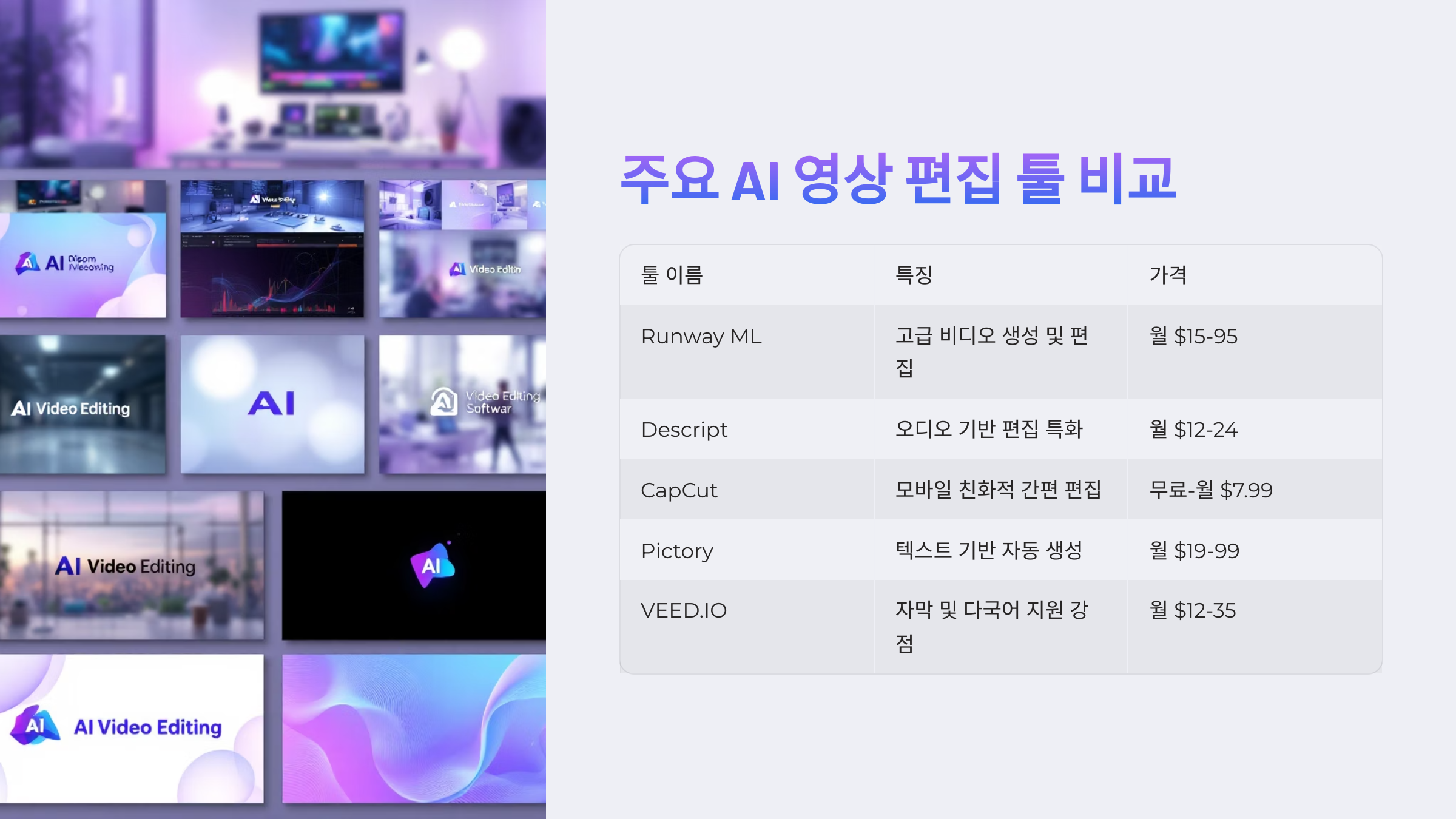 📊 주요 AI 영상 편집 툴 비교표