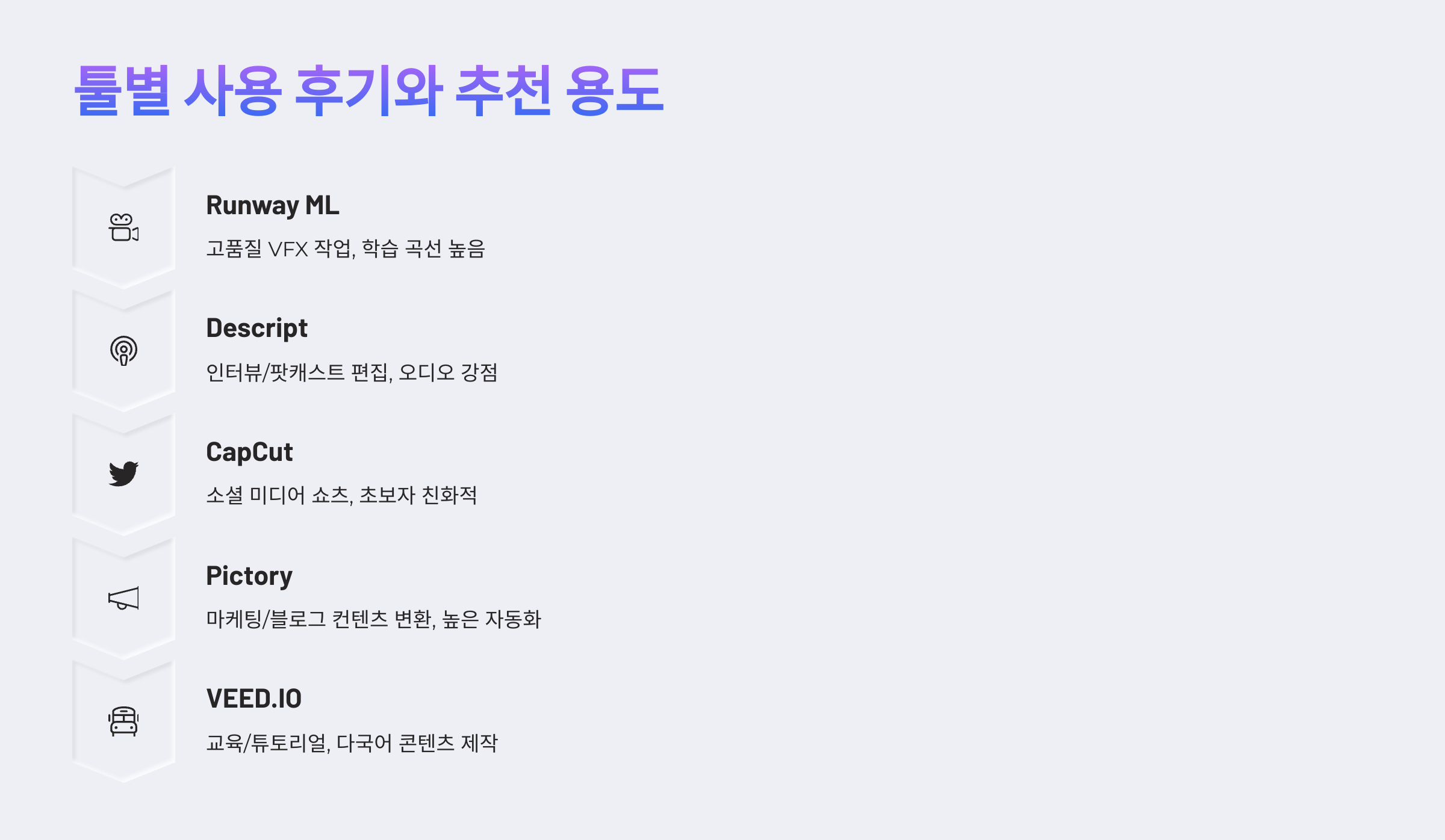 A8. 목적에 따라 달라요. 마케팅 콘텐츠엔 Pictory, 브이로그는 Wisecut, 트렌디한 숏폼은 Runway ML, 음성 위주 영상엔 Descript를 추천해요! 🙌