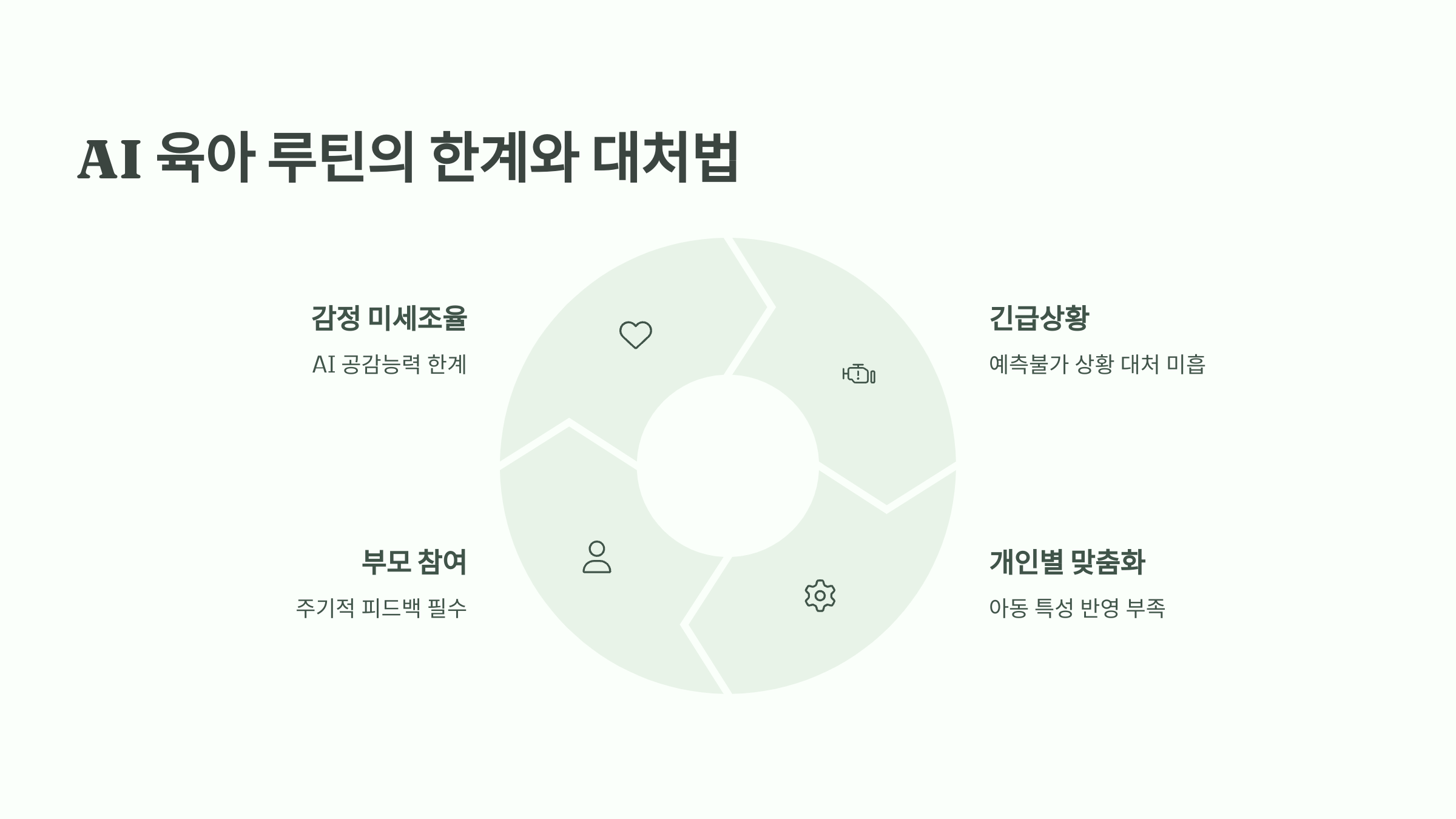 첫 번째 한계: 아이의 감정 변화를 AI가 완벽히 읽을 수는 없어요. 컨디션이나 기분 변화는 결국 부모가 직접 관찰해야 해요.