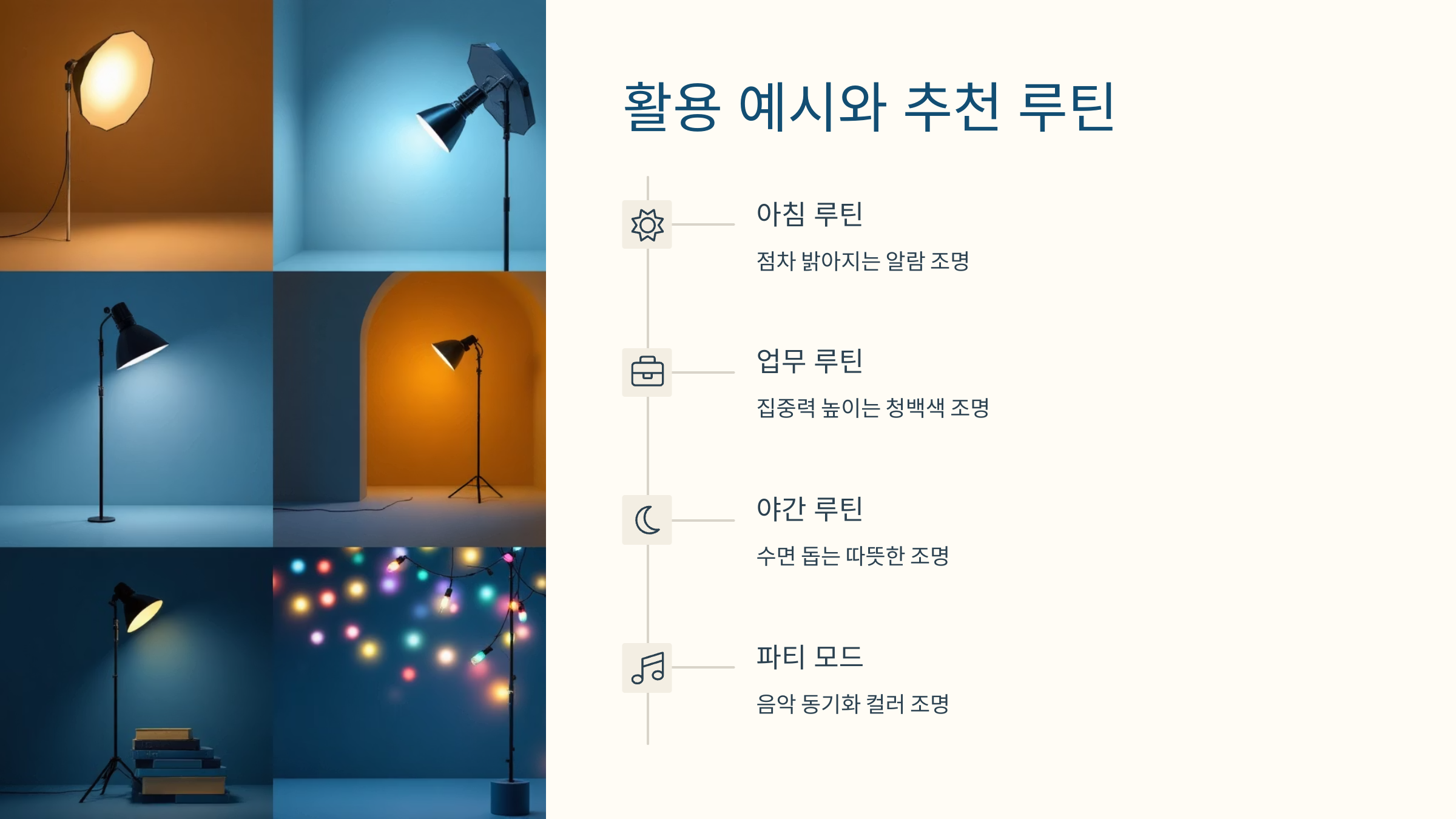 스마트 조명을 제대로 쓰려면 ‘루틴 설계’가 중요해요. 아래는 일상에서 정말 유용하게 쓸 수 있는 AI 조명 루틴 예시예요. 하나씩 따라 해보면 생활이 훨씬 편해져요!