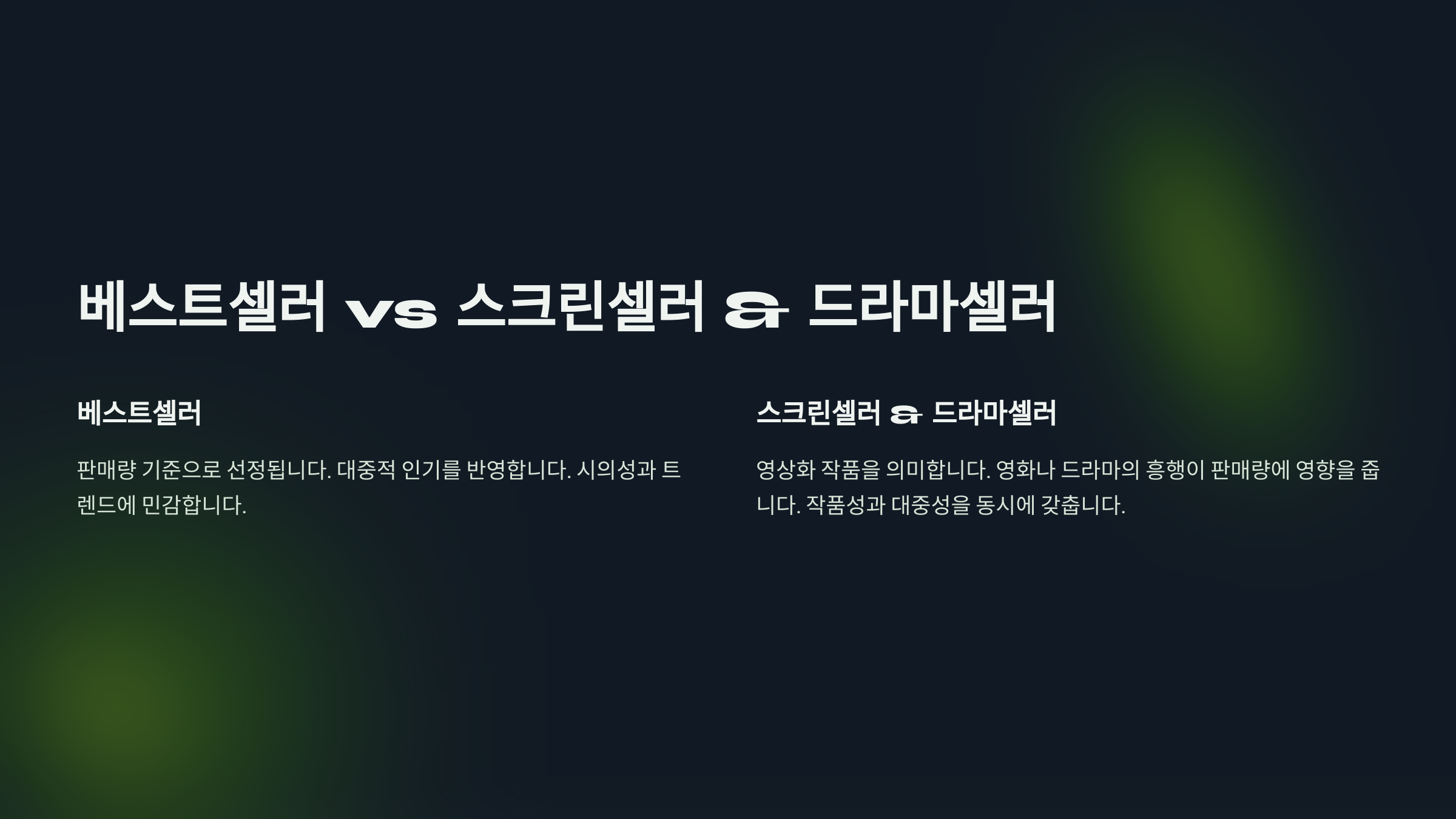 베스트셀러, 스크린셀러, 드라마셀러 모두 많이 팔리는 책을 의미하지만, 그 차이는 책이 인기를 끄는 시점과 이유에 있어요. 📚