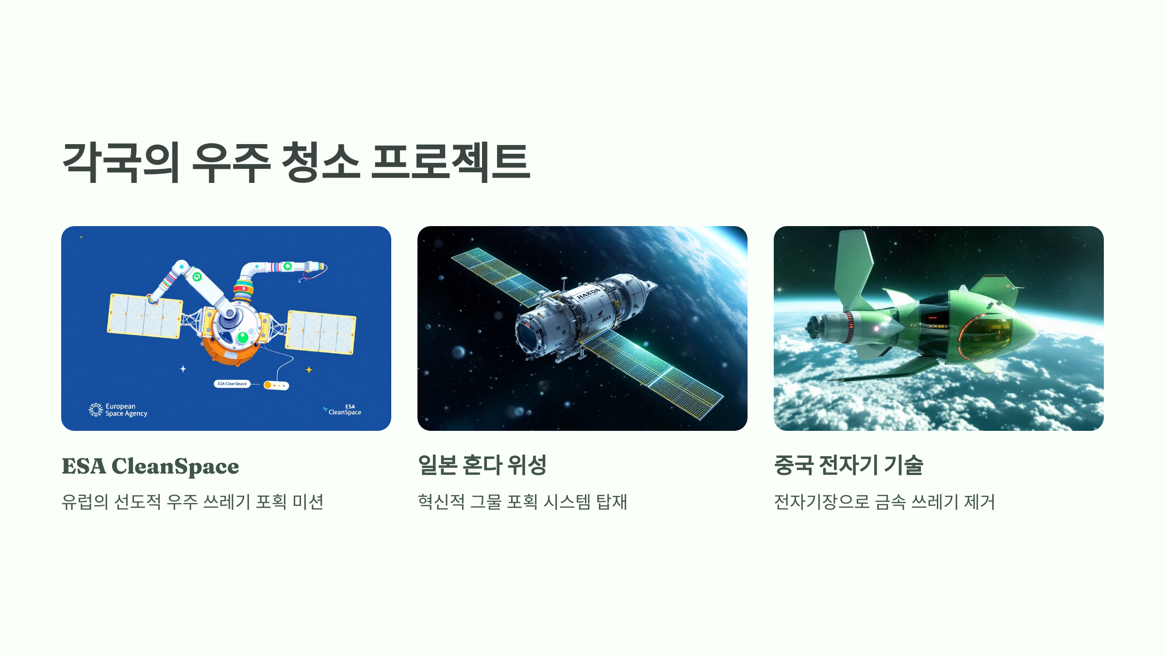 2021년, 일본 민간기업 Astroscale은 ‘ELSA-d’ 미션을 통해 궤도상 쓰레기 모사체를 실제로 붙잡고 떨어뜨리는 실험에 성공했어요. 지구 최초의 우주 쓰레기 포획 성공 사례로 평가돼요.