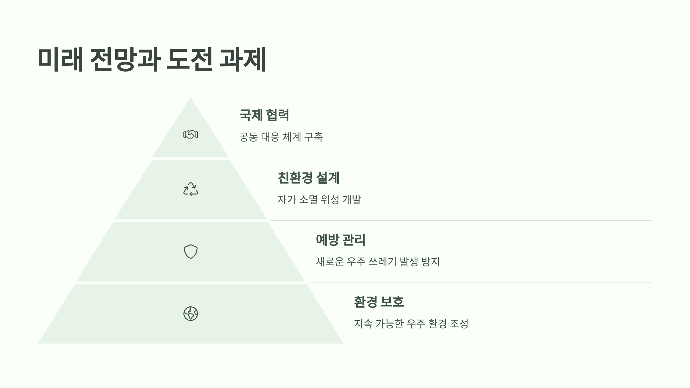 셋째, 미래 전망은 ‘청소 + 예방’ 병행이에요. 앞으로는 우주 쓰레기를 줄이는 기술과 함께, 처음부터 쓰레기가 생기지 않도록 하는 디자인도 중요해질 거예요.