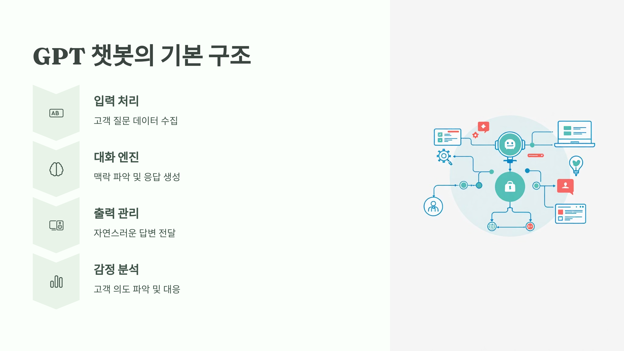 GPT로 챗봇을 만들기 위해서는 단순히 질문과 답을 주고받는 구조를 넘어서야 해요. 기본적으로 다음과 같은 요소들이 포함돼야 고객 응대 챗봇으로 완성도 있게 작동할 수 있어요.