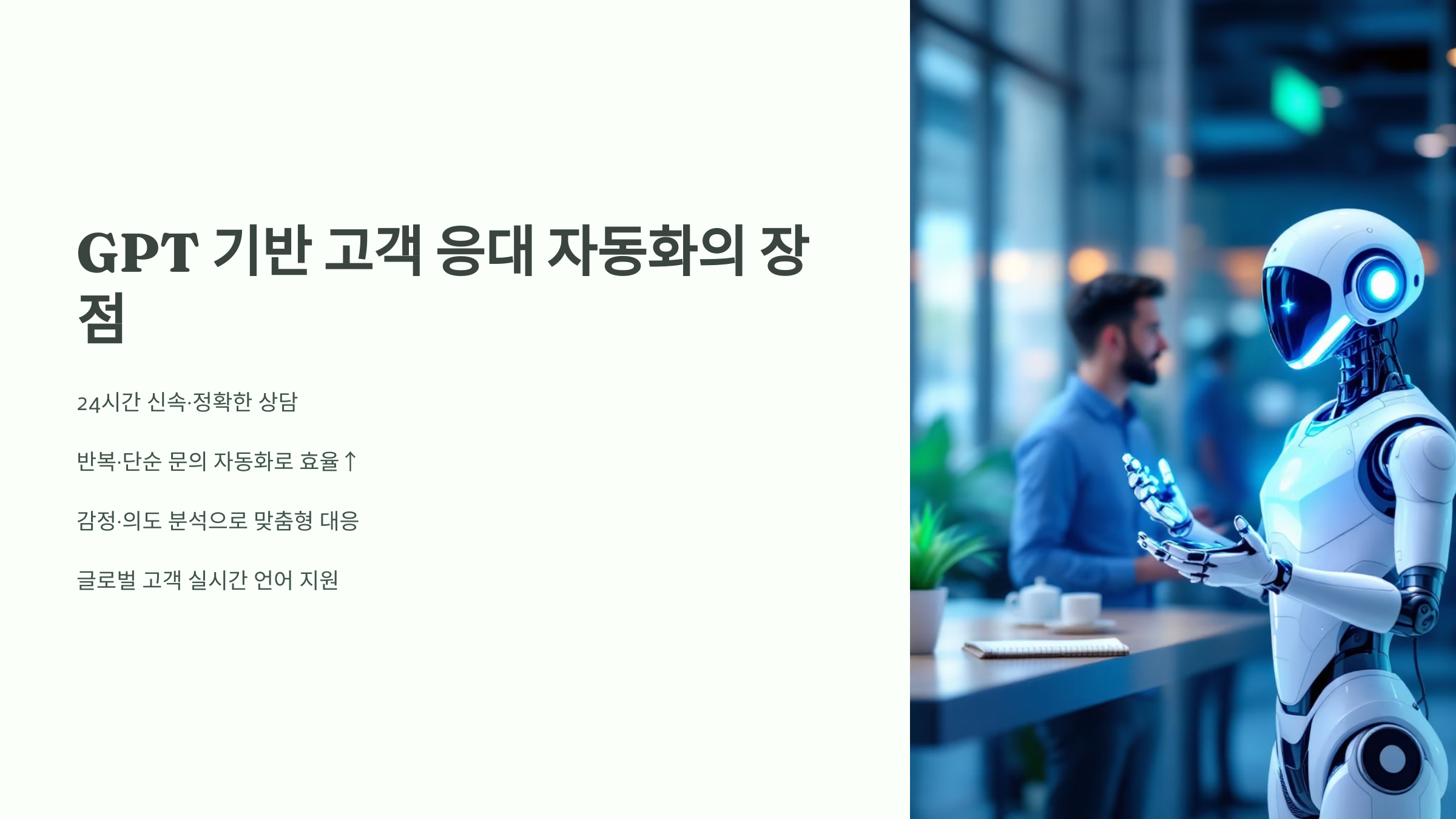 GPT는 단순한 정답만 주는 챗봇이 아니라, 문맥을 이해하고 감정까지 고려해 자연스럽게 대응할 수 있는 지능형 AI예요. 그래서 반복 문의, 불만 처리, 가이드 안내 등 다양한 업무에 활용할 수 있어요.